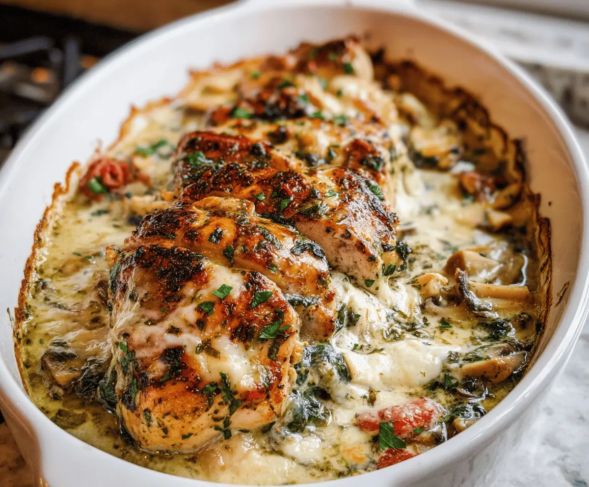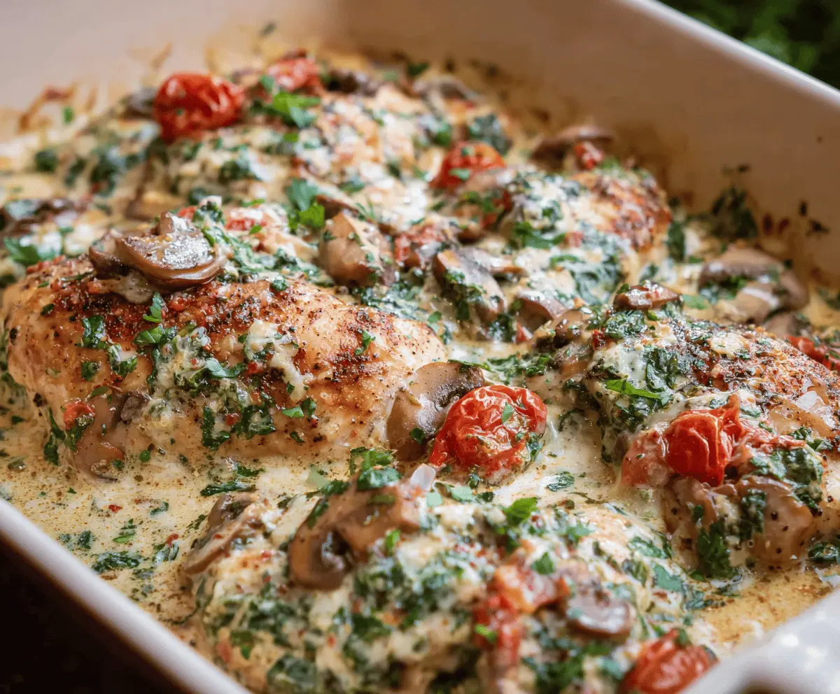 Baked Tuscan Chicken Casserole is a wonderful blend of tender chicken, creamy sauce, and rich flavors from sun-dried tomatoes, garlic, and spinach. It’s all baked together with a cheesy topping that gets golden and bubbly, making every bite comforting and full of delicious surprises.