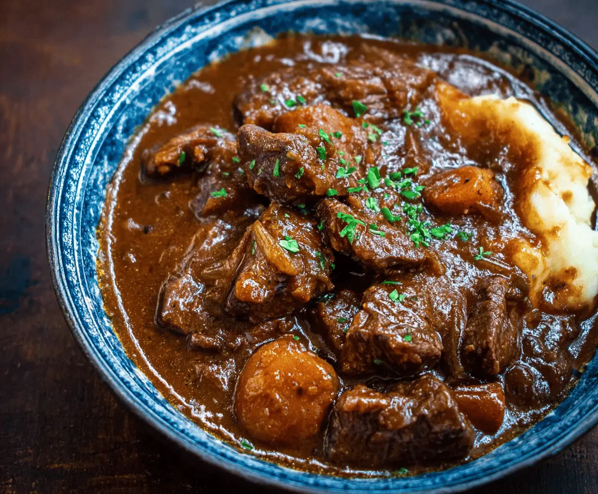 Hearty Beef Carbonnade Stew with tender beef chunks, caramelized onions, and rich gravy served in a rustic bowl