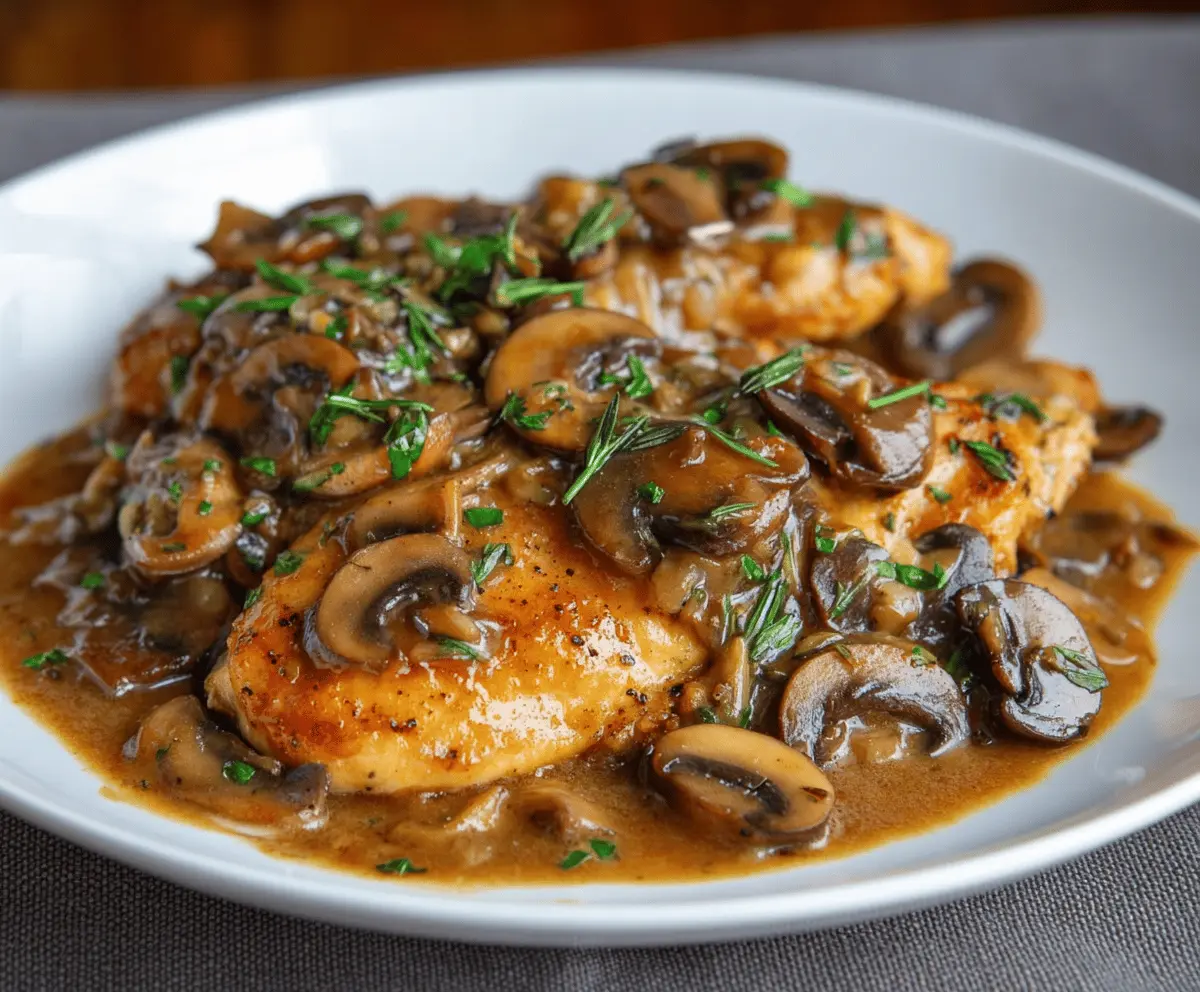 Savory Chicken Marsala served with a rich mushroom and wine sauce on a white plate, garnished with fresh herbs
