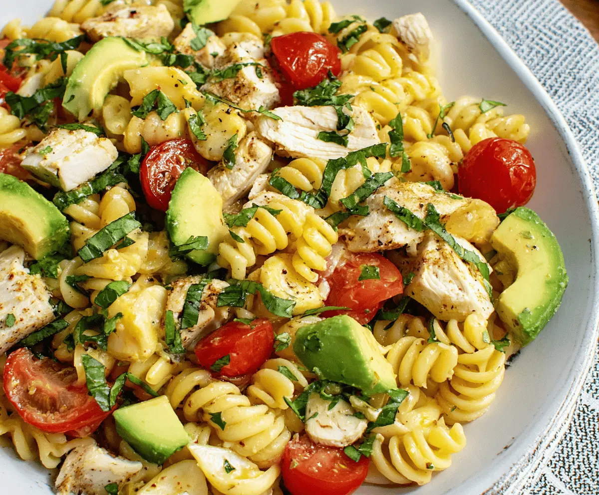 Fresh Chicken Pasta Salad with Avocado, Tomato, and herbs in a colorful bowl, perfect for a healthy meal