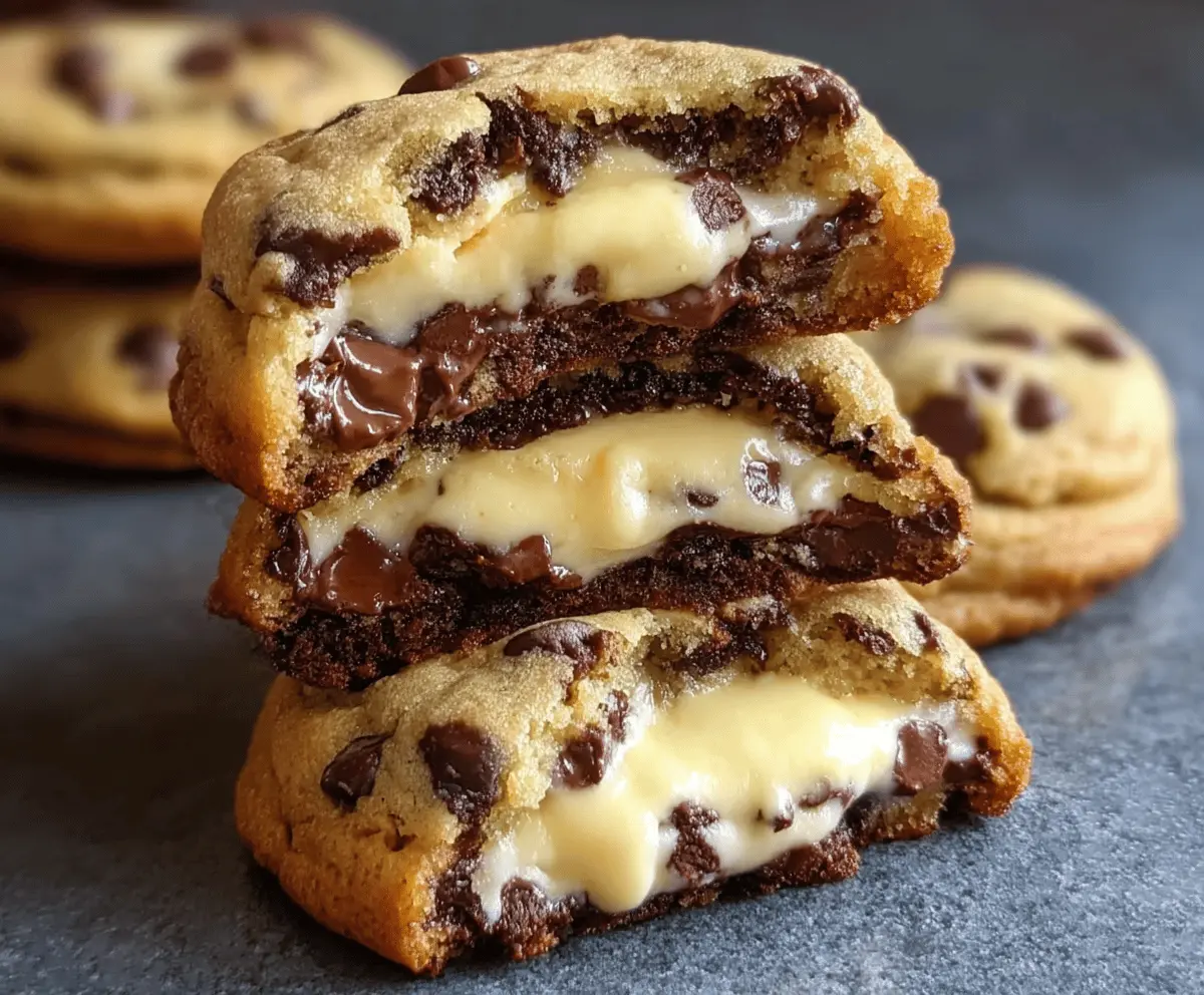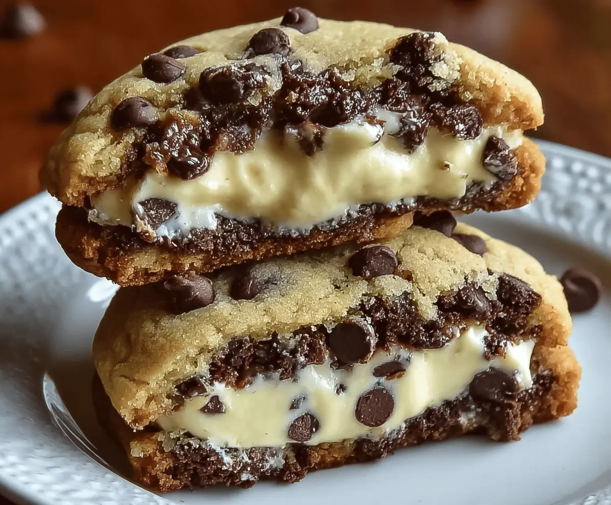 Delicious chocolate chip cookies filled with creamy cheesecake filling, showcasing golden-brown cookies with melted chocolate chips and a rich, smooth cheesecake center.