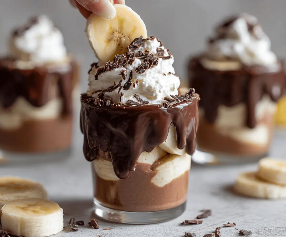 Delicious chocolate-covered banana pudding cups topped with whipped cream and chocolate drizzle, perfect for a sweet dessert treat.