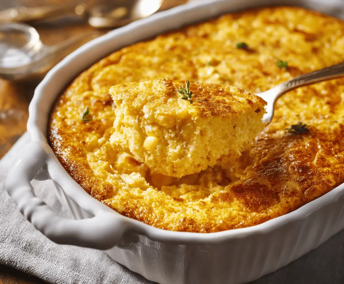 Creamy and flavorful corn pudding served in a baking dish, topped with a sprinkle of fresh herbs, perfect as a comforting side dish.