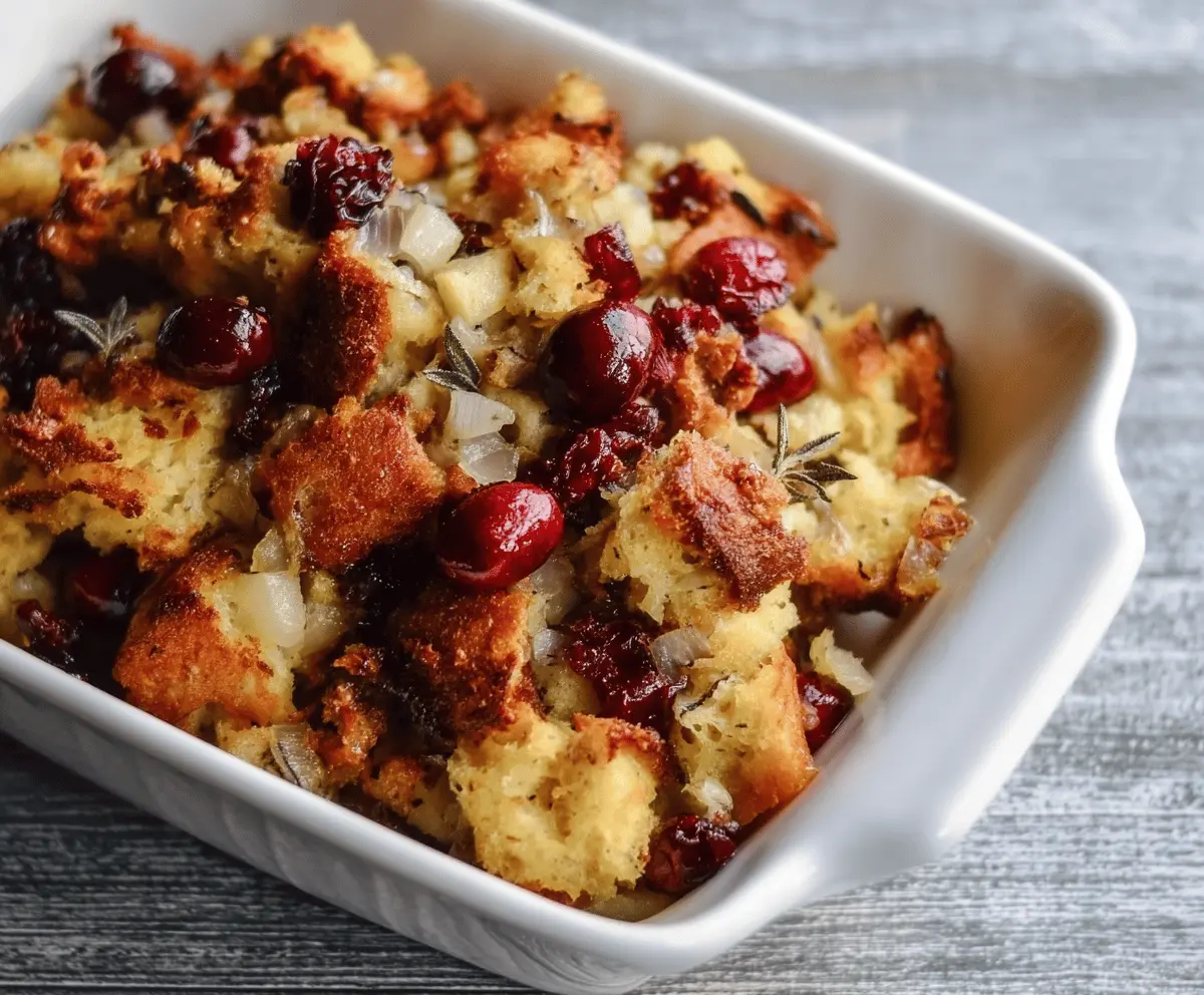 Delicious cranberry apple stuffing in a serving dish, featuring fresh cranberries, diced apples, herbs, and golden bread cubes for a flavorful holiday side dish