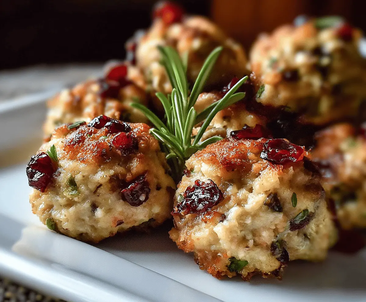 Delicious Cranberry Turkey Stuffing Balls served on a plate with fresh cranberries and herbs, perfect for holiday dinners.