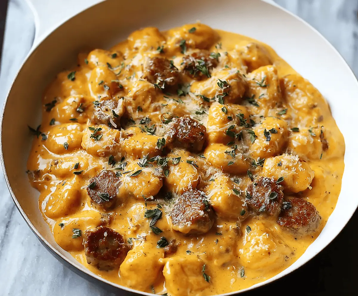 Creamy butternut squash gnocchi with sausage, garnished with herbs, served on a plate for a delicious fall-inspired dish.