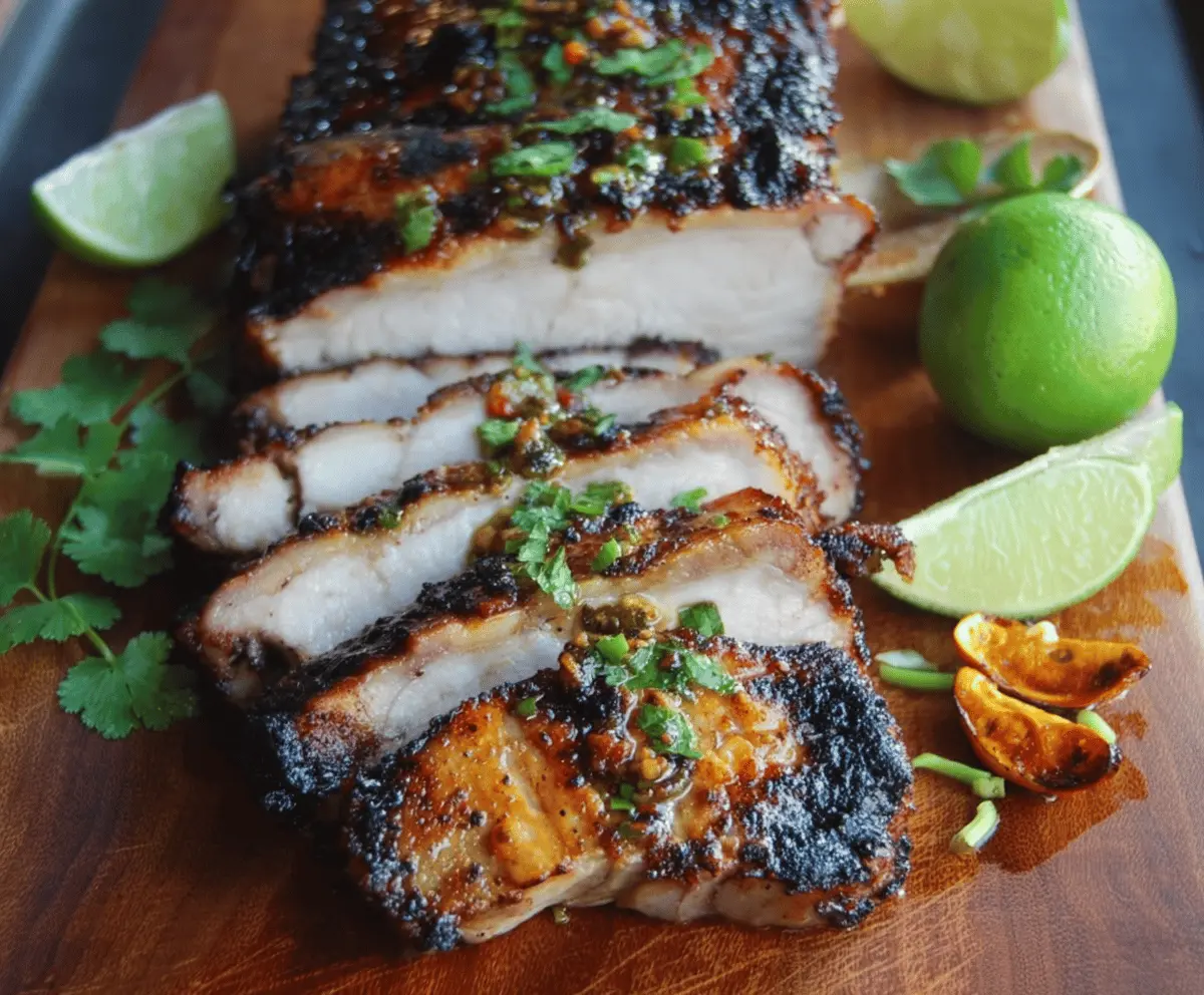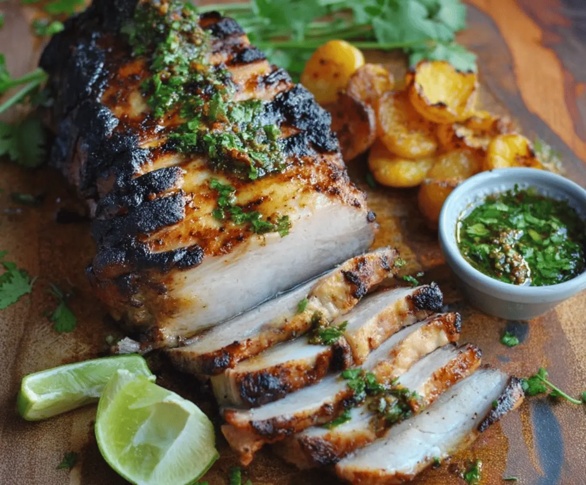 Remove the pork from the grill and let it rest for 10 minutes to allow the juices to redistribute. Then slice the pork into thick pieces, spoon any juices from the resting plate over the slices, and garnish with fresh cilantro.