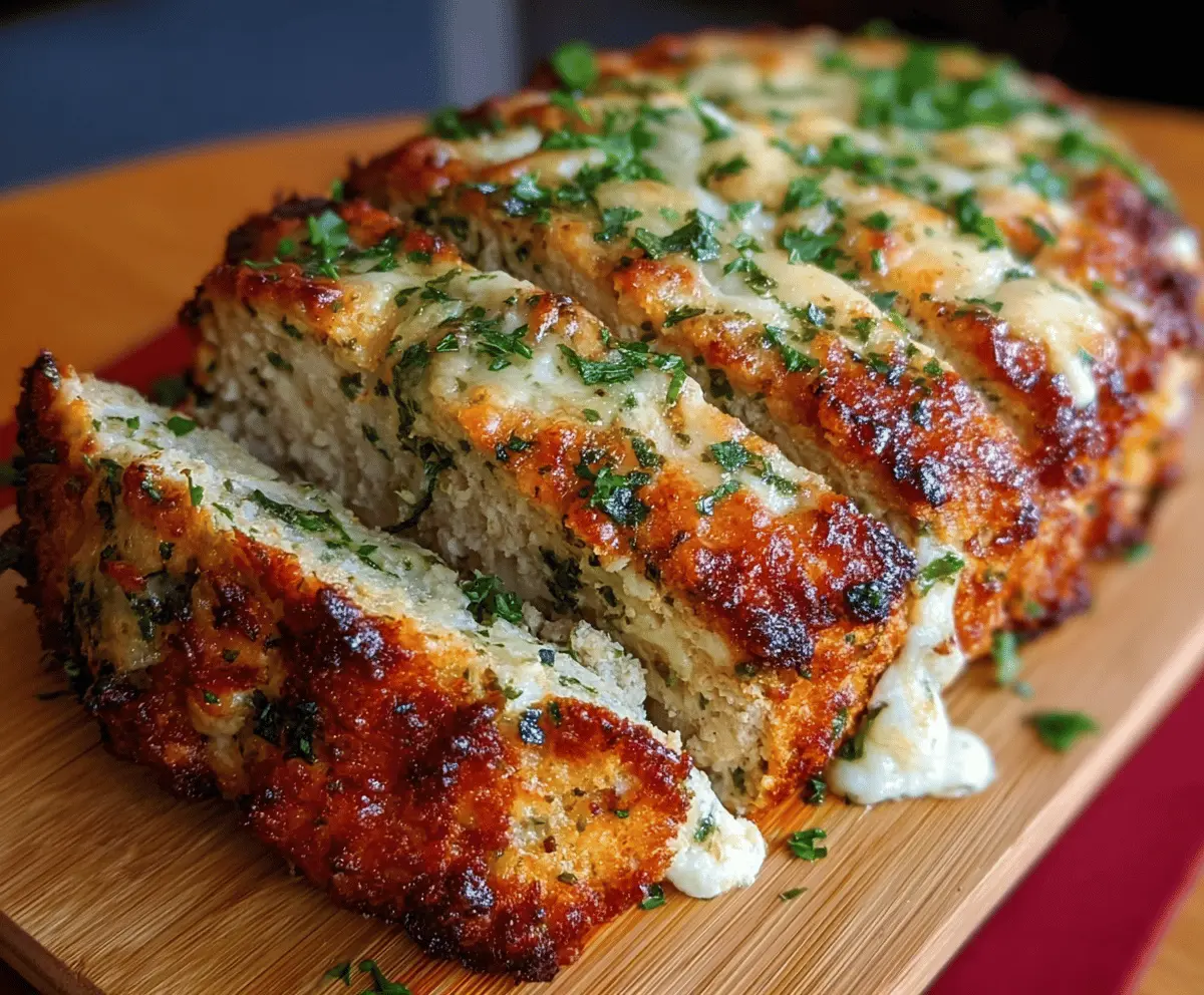 Delicious Garlic Parmesan Chicken Meatloaf topped with melted cheese and fresh herbs, ready to serve
