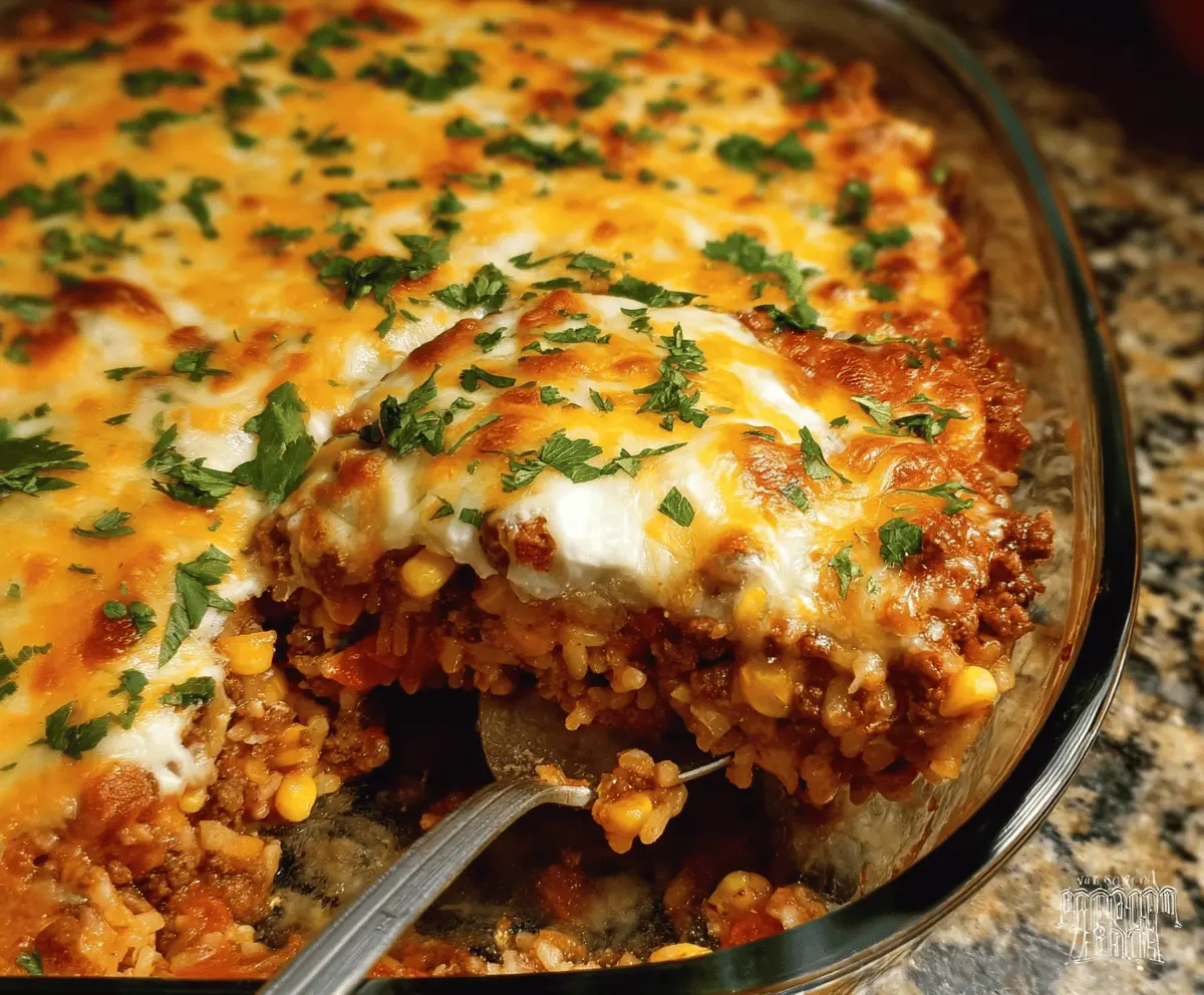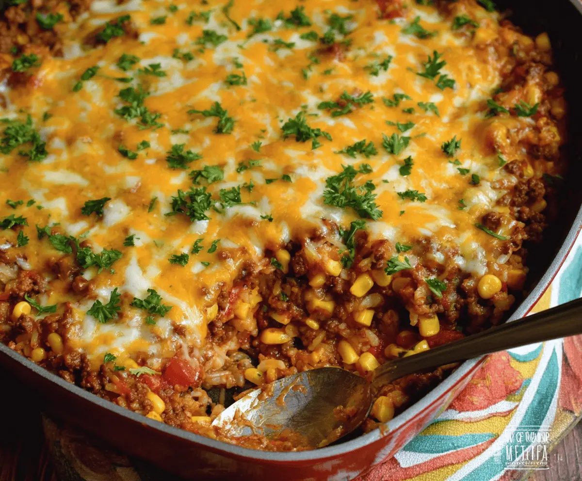 Grease a 9×9-inch (or similar) baking dish. Pour the beef, rice, and corn mixture into the dish and spread it evenly. Sprinkle the shredded cheddar and Monterey Jack cheeses on top. Bake uncovered for 15-20 minutes, until the cheese is melted, bubbly, and golden brown on top.
