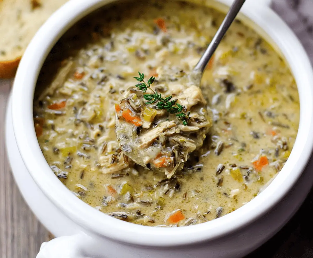 Hearty bowl of Healthy Chicken Wild Rice Soup with tender chicken, wild rice, and fresh vegetables in a creamy broth