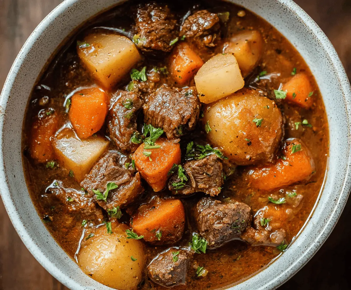 Remove the bay leaf, taste, and add extra salt or pepper if needed. Serve the stew hot, garnished with fresh parsley or thyme if you like. It’s wonderful with crusty bread or over mashed potatoes for a filling meal.