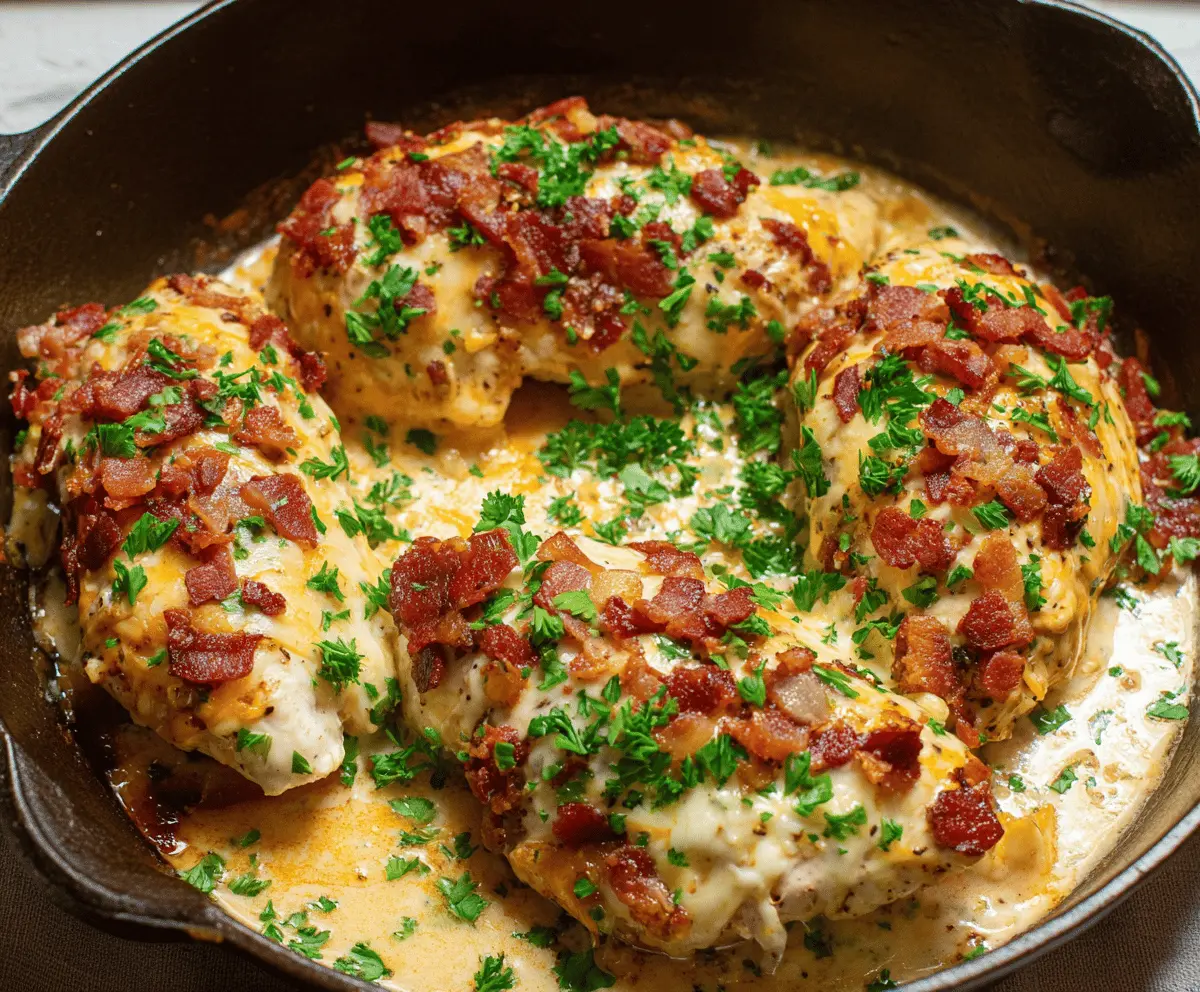 If you like your sauce a bit creamier, carefully remove the chicken from the skillet and stir in the chicken broth to the melted cheese and bacon juices. This creates a delicious pan sauce to pour over the chicken. Finally, sprinkle fresh chopped parsley on top for a fresh, colorful touch before serving.
