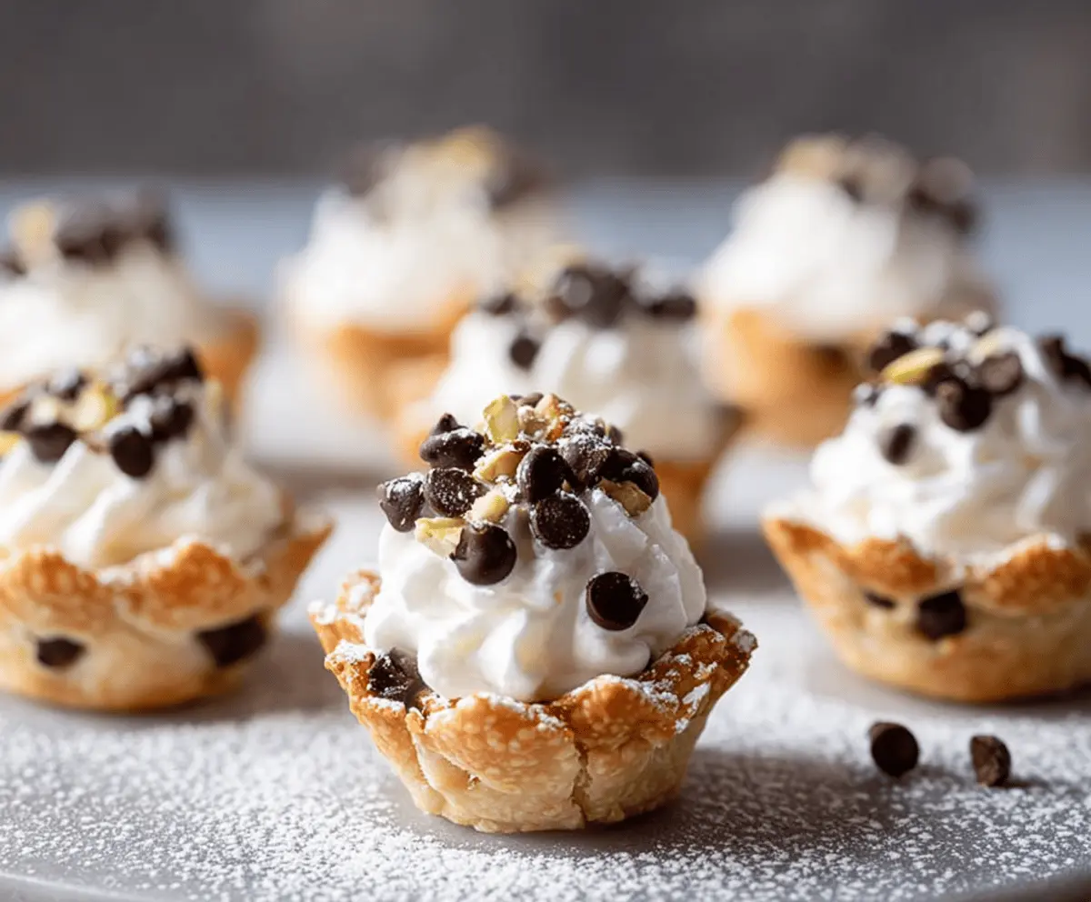 Mini Cannoli Bites with creamy ricotta filling, chocolate chips, and crispy shells on a decorative plate